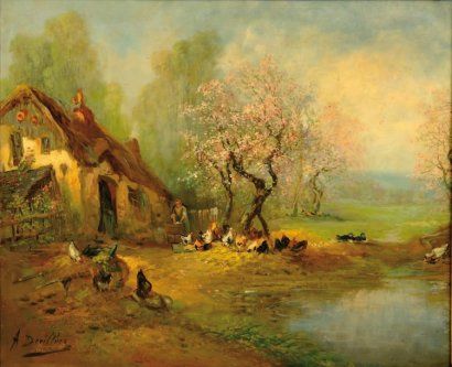Femme faisant sa lessive devant une chaumière, mare et basse-cour.