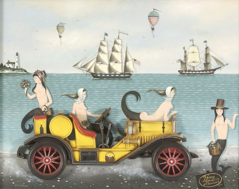 | An unusual painting/collage depicting an offshore scene with two ships, lighthouse and two balloons | |