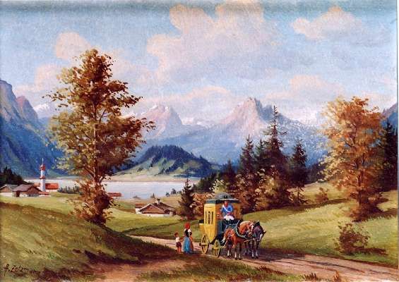 Berglandschaft mit Dorf an einem See und Postkutsche im Vordergrund