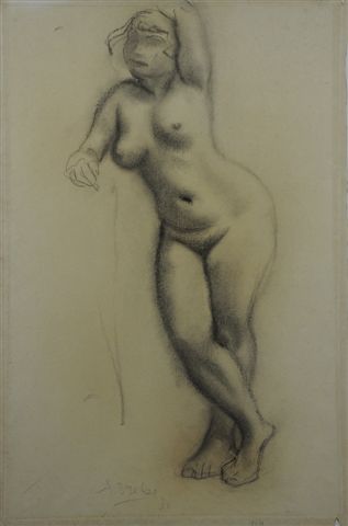 Nu féminin debout, jambes croisées, bras gauche relevé