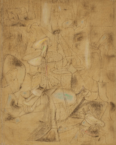 | Pencil charcoal, pastel and wax crayon on burlap paper | |