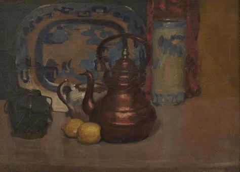 STILL LIFE OF COPPER POT WITH LEMONS