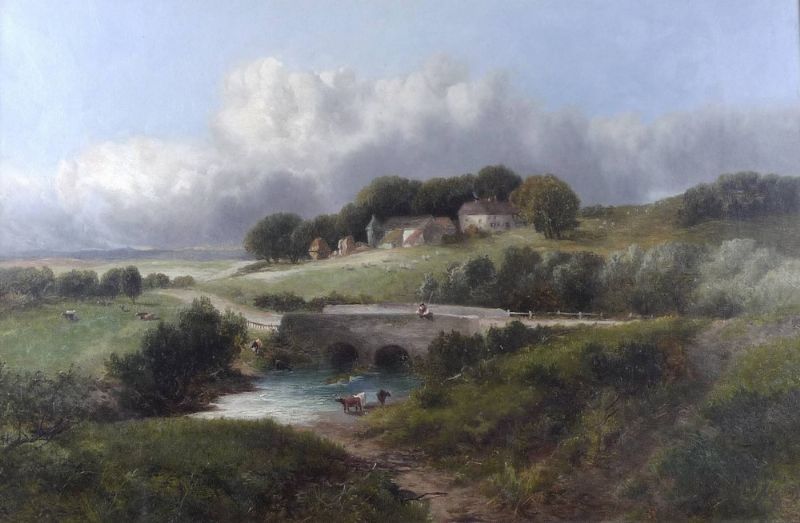 a landscape with bridge and cattle by the stream