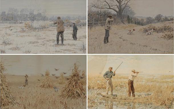 | Four sporting chromolithographs Rail Shooting, Rabbit Shooting, Prairie Chickens, English Snipe, from Shooting Pictures | |