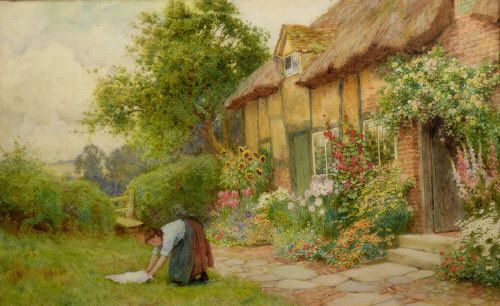 A COTTAGE GARDEN WITH A WOMAN IN THE FOREGROUND