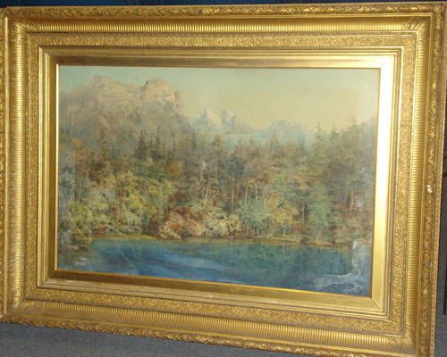 | A lakeside, pine trees and snow capped mountains beyond, probably North American | |