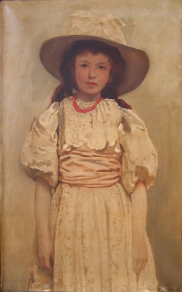 | Three-quarter Length Portrait of a Girl, probably Yvonne Isabella Forster, wearing a Hat with Ribbon Band, Cream Dress and Coral | |