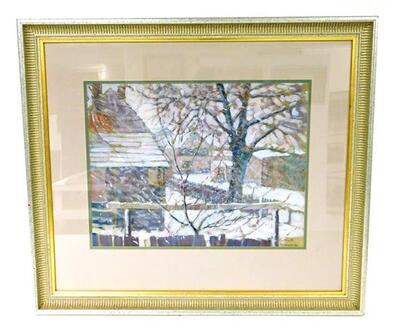 | Depicts a New England town center during blizzard conditions, fence in foreground with buildings slightly obscured by snow | |