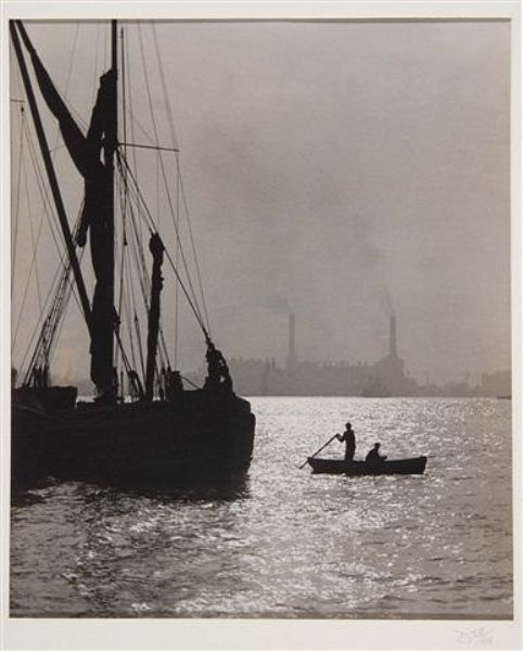 Monochrome photograph of a ship moored on the River Thames titled sunset, Greenwich Reach