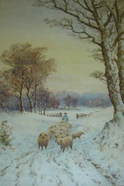 Shepherd with sheep in Winter landscape