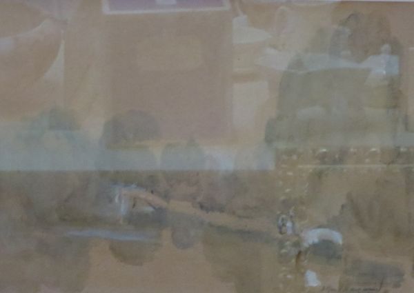 Figures approaching a bridge over a river