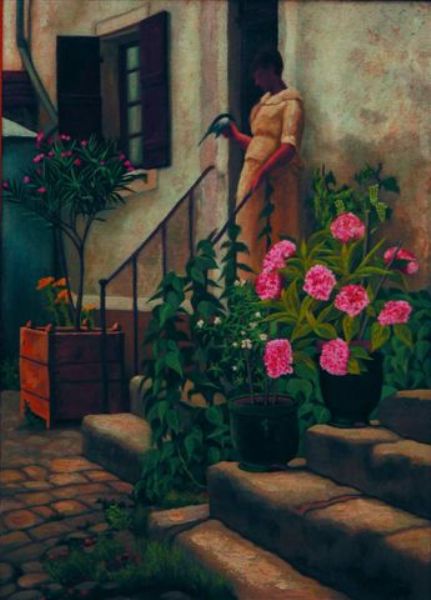 | A woman with a small bird on the steps of a house, probably in Southern France | |