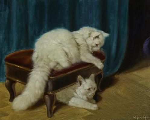 WHITE PERSIAN CATS PLAYING ON A FOOTSTOOL