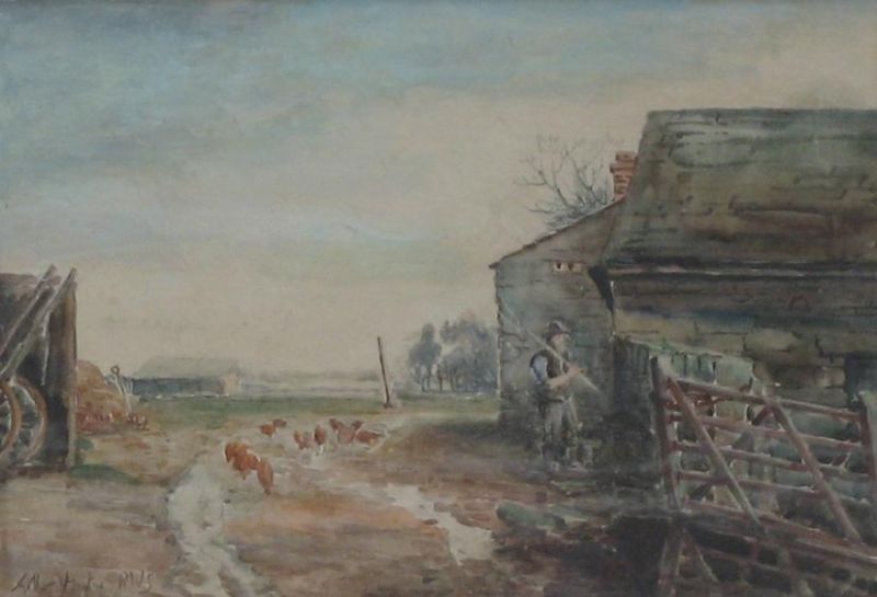 Farmyard scene, with labourer and chickens