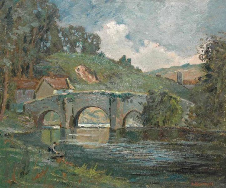 A river landscape with cottages and a stone bridge