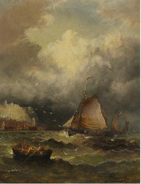 A coastal scene with men piloting boats on a turbulent sea and a town in the distance
