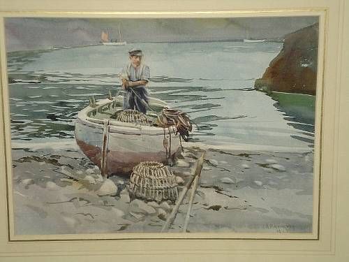 | Eperquerre, Sark, Mr. De Carteret, a local fisherman standing in a beached fishing boat coiling ropes | |