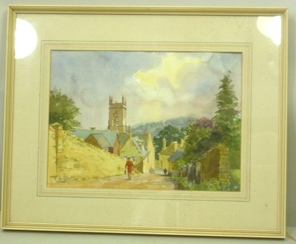 Blockley, Nr Chipping Campden A view with two figures on a sunny street and church tower beyond