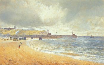 | The beach at Boulogne, with fishermen walking along the beach and bathers in the sea by bathing machines | |