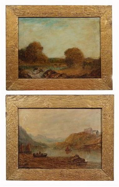 Boats on the river in an extensive landscape and a companion piece of figures walking beside a river