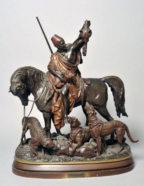Cavalier arabe tenant une peau de panthère devant ses chiens