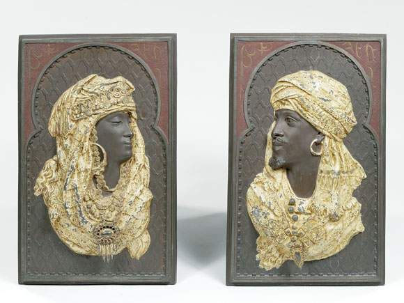 COUPLE D'ORIENTAUX richement parés sur fonds architecturés.
