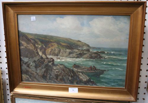 | Coastal View with Two Figures in a Boat near a Rocky Cove | |