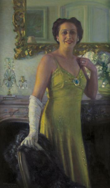 Ritratto di signora in piedi davanti al camino