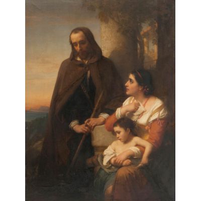 Jonge familie op bedevaart voor zuiders kustgezicht bij valavond.