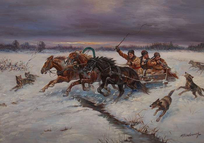 | Angriff eines Wolfrudels auf Troika bei Abenddämmerung in weiter Winterlandschaft | |