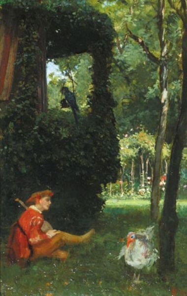 Tuinaanzicht waarin een zittende nar met luit, een papegaai en een kalkoen
