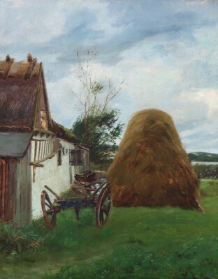 A harvestmotif with a haystack behind a barn