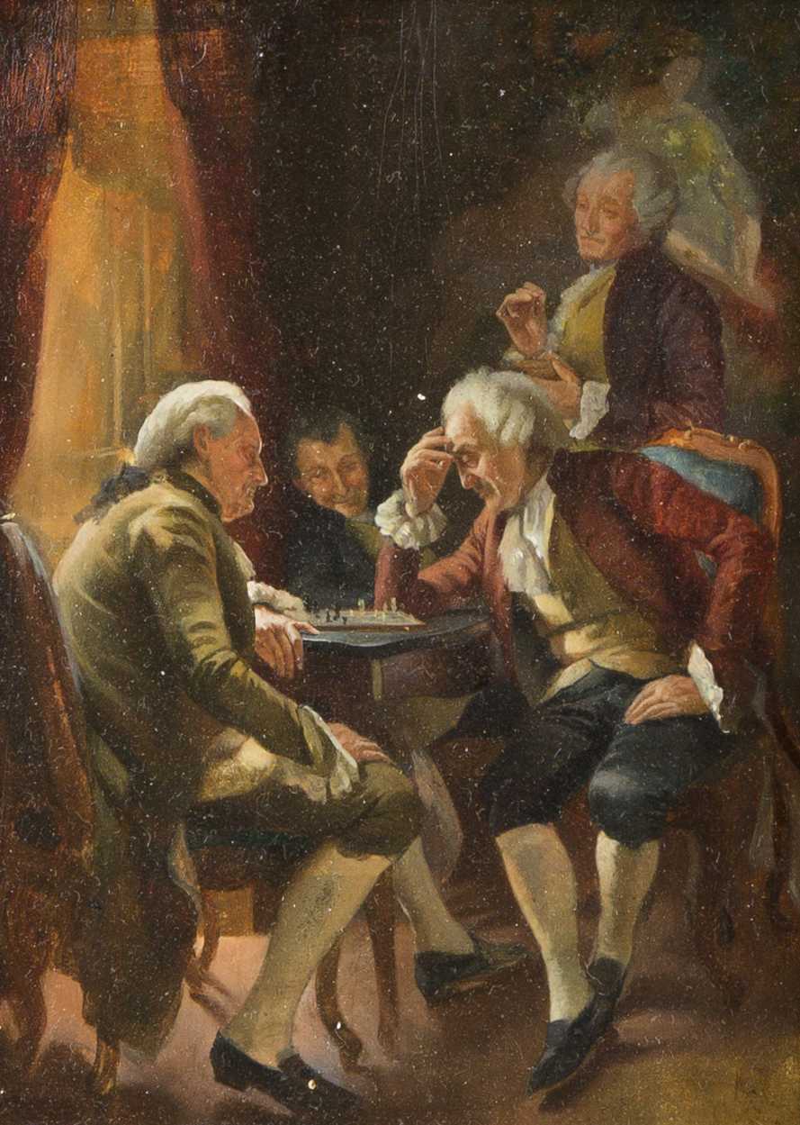 | Oil on wooden panel depicting two gentlemen playing chess | |