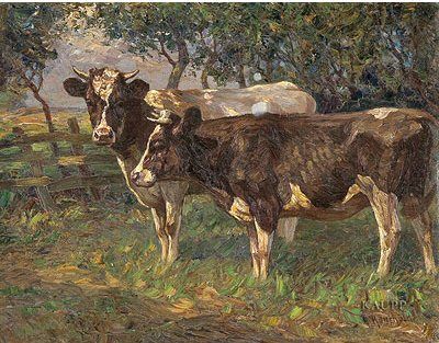 In sommerlicher Landschaft im Schatten nahe dem Weidezaun stehendes Paar Kühe.