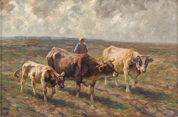 Magd mit drei Kühen auf der Weide
