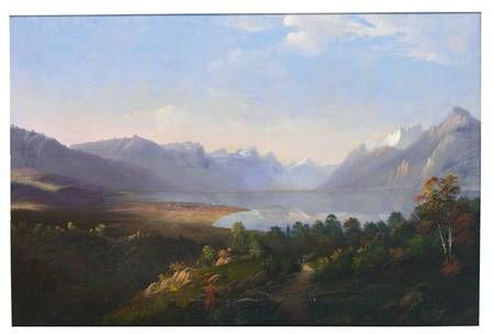 | Blick über den Genfer See auf Genf und Alpenpanorama. Romantische Schilderung. | |