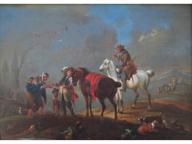 A CAVALIER AND A HUNTSMAN MEETING BEGGARS