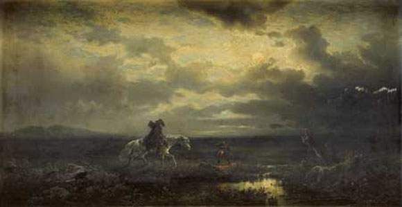 VOYAGEUR DANS UN PAYSAGE DE MARAIS AU CLAIR DE LUNE