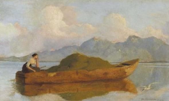 Junge Bäuerin im Heuboot auf dem Chiemsee