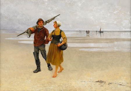| Fiskare och musselplockerska på stranden | |