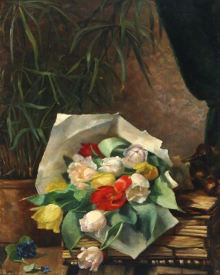 Still-life with colourful tulips on a table
