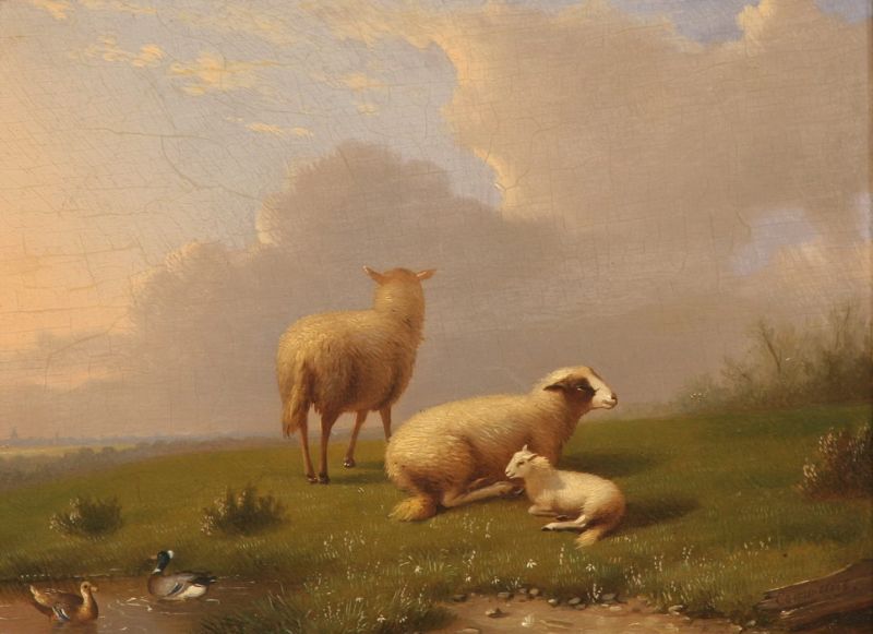 | Een paar panelen met afbeelding van schapen, kippen en eenden in een landschap | |