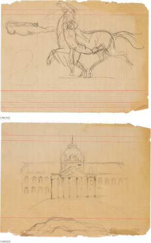 | HOMME TENTANT DE MAÎTRISER UN CHEVAL ET ÉTUDE POUR VIRGINIE ? - RECTO FAÇADE DE L'INSTITUT ? ET PERSONNAGE ALLONGÉ - VERSO | |