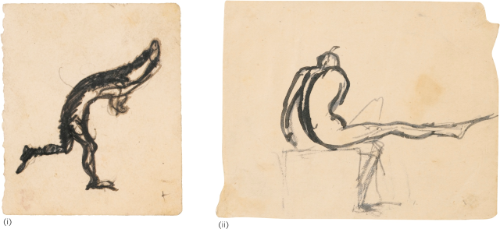 (I) COUREUR COURBÉ VERS LA DROITE, UN PIED EN L'AIR ET LES BRAS JOINTS AU-DESSUS DE LA TÊTE - ETUDE DE PATINEUR SUR GLACE? (II) HOMME NU DE DOS, ASSIS SUR UN SOCLE, LA JAMBE DROITE TENDUE. ETUDE DE PATINEUR SUR GLACE AU REPOS? | |