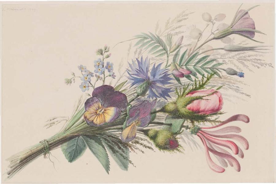 | Bouquet de pensées, roses, myosotis et oeillets | |