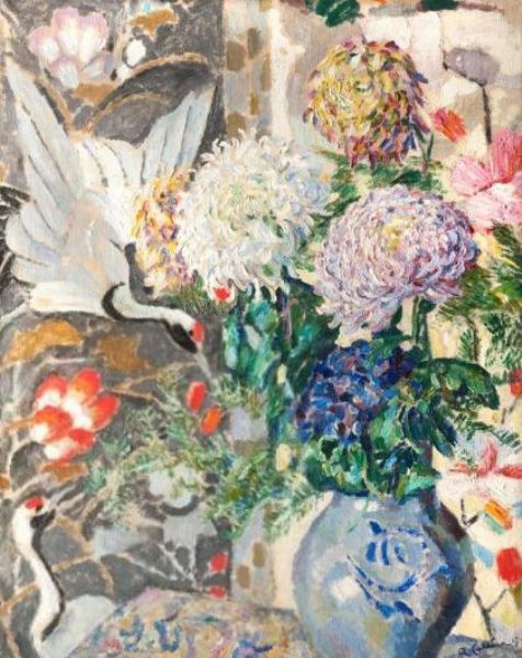 Nature morte aux pivoines et décor aux grues du Japon