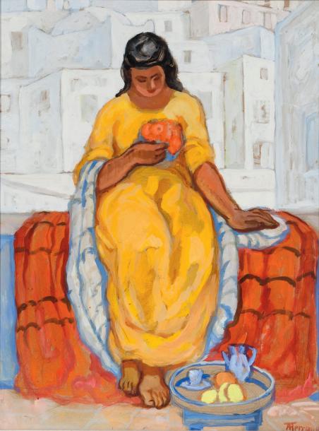 Jeune algéroise au bouquet de fleurs sur une terrasse