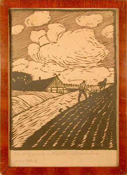 Im Vordergrund ein pflügender Bauer mit Pferdegespann