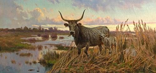 | A water buffalo and her calf in a marshy landscape | |