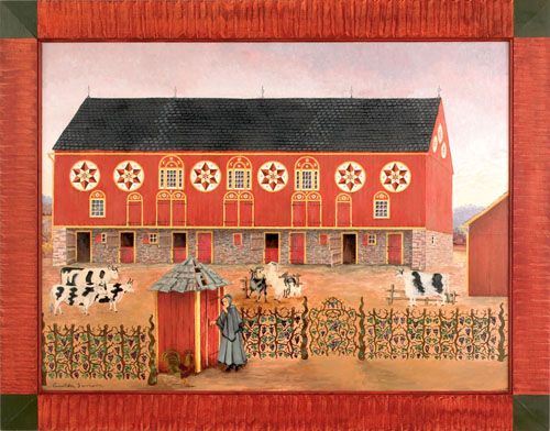 | Folk art farm scene with grapevines and animals before a large barn | |